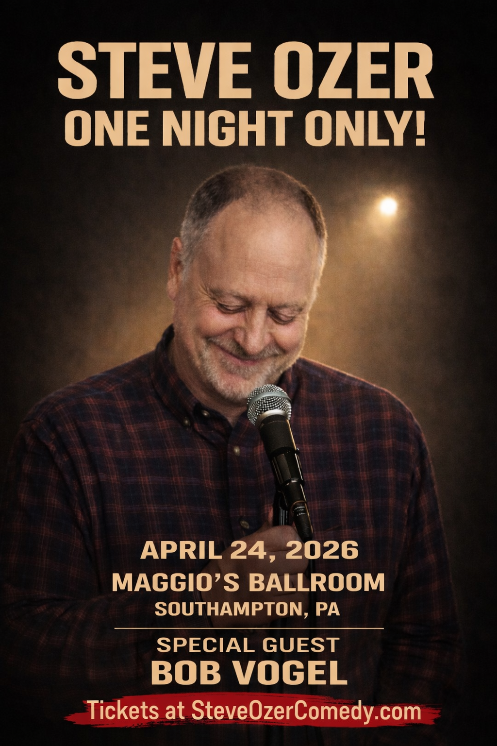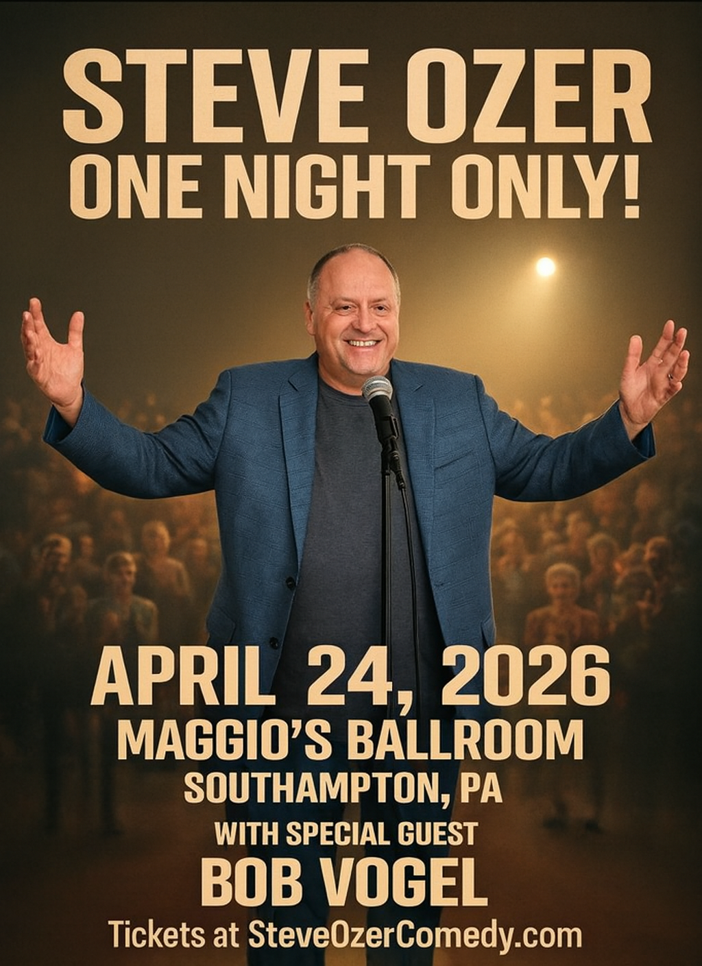 Here’s your chance to catch Steve Ozer’s stand up comedy performance, live at Maggio’s Ballroom in Southampton, Pa, on Friday, April 24th, at 6 pm. Doors open at 5:30 pm; hors de ourves and cash bar, 6-7 pm; show at 7 pm. Seating is